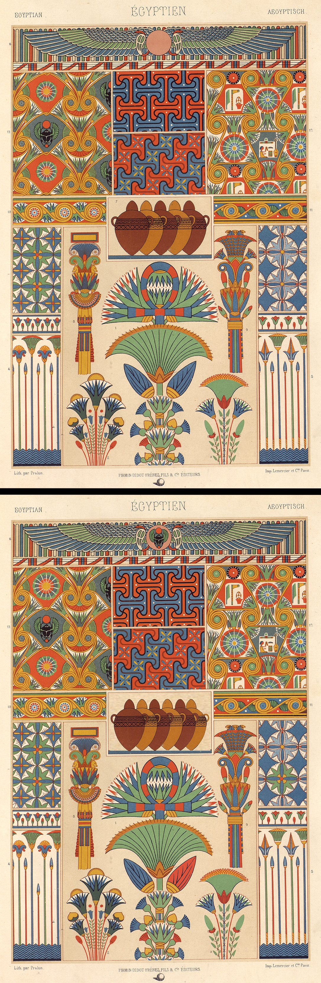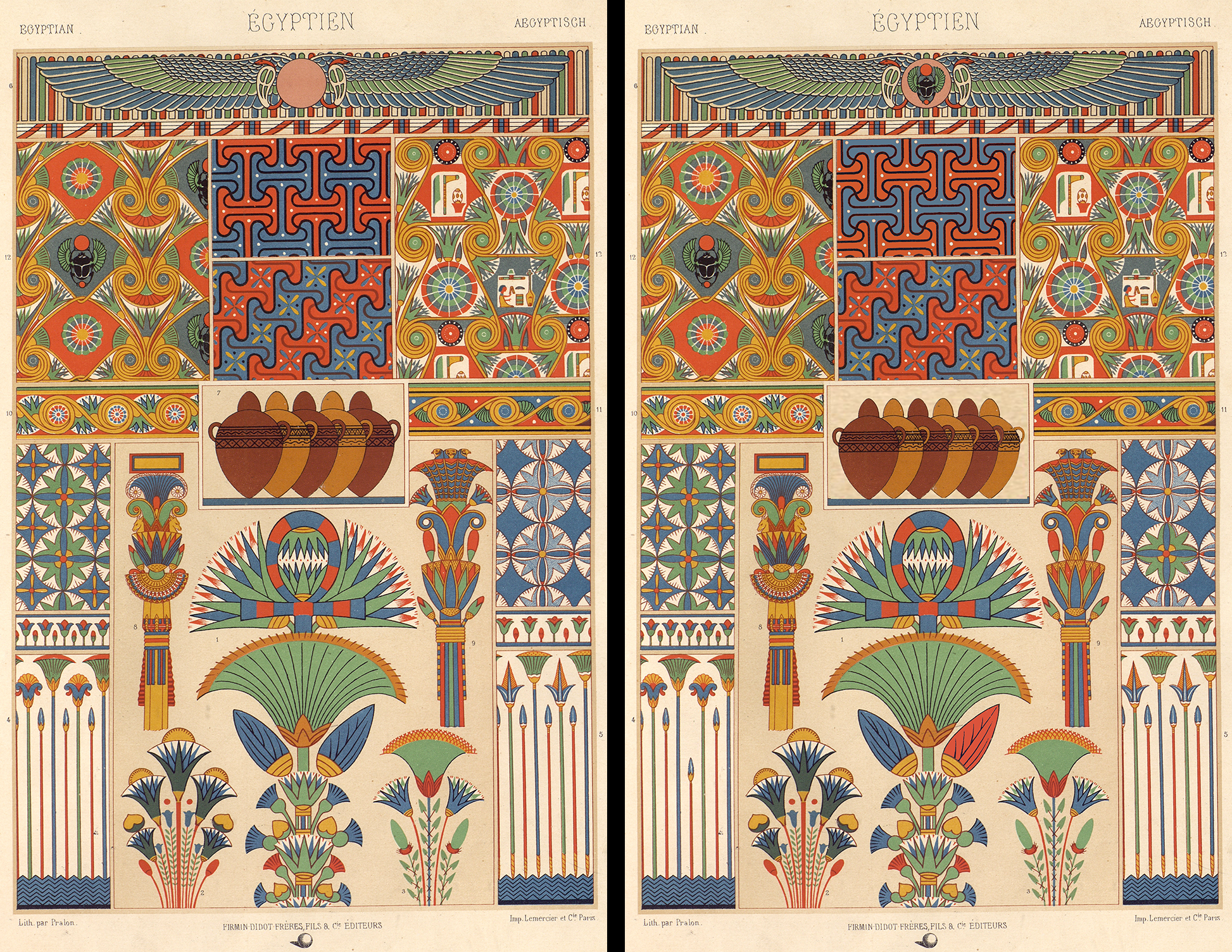 Saurez-vous retrouver les 7 différences cachées dans cette planche de décor Egyptien du livre "Ornement polychrome" d'Auguste Racinet (1183) ?