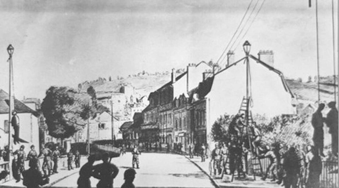 (Dessin anonyme des pendaisons de Tulle, le 9 juin 1944. (s.d.) 1 PH 1921©Collections Musée de Tulle – Ville de Tulle)